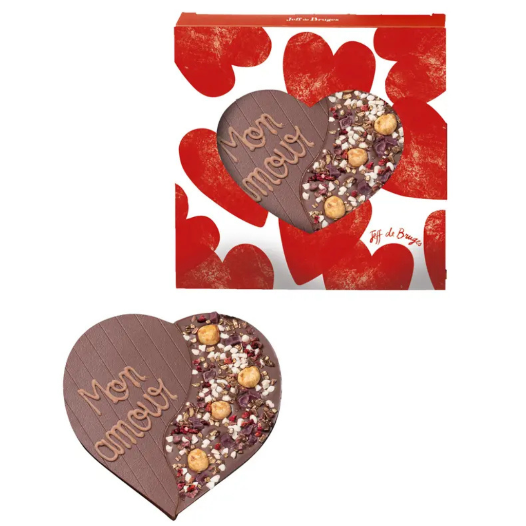 CŒUR DE CHOCOLAT AU LAIT DÉCORÉ DE NOISETTES ENTIÈRESCARAMELISÉES, PÉPITES DE PECTINE À LA MYRTILLE, NOUGAT, PAILLETTESDE CHOCOLAT BRONZE ET FRAMBOISES DÉSHYDRATÉES LYOPHILISÉES.