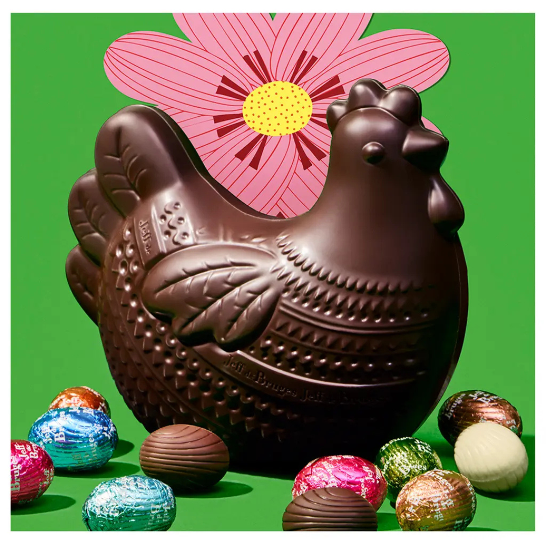 Notre poule en chocolat se modernise et change de style ! Découvrez la poule Colette, cette jolie poule arbore un décor gravé de lignes concaves composées de légers creux et de petits embossages qui lui donne à la fois sa personnalité et son élégance.