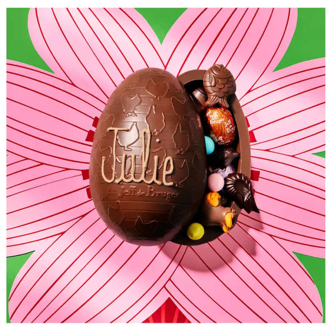 Sophie, Raphaël, Louve, Louis… Nous personnalisons vos oeufs de Pâques en écrivant les prénoms de vos poussins ! Cet oeuf géant en chocolat au lait 36% cacao d’Équateur garni de délicieuses gourmandises rendra à coup sûr la chasse aux oeufs mémorable ! A chacun son oeuf, grâce à la personnalisation e cadeau devient unique.